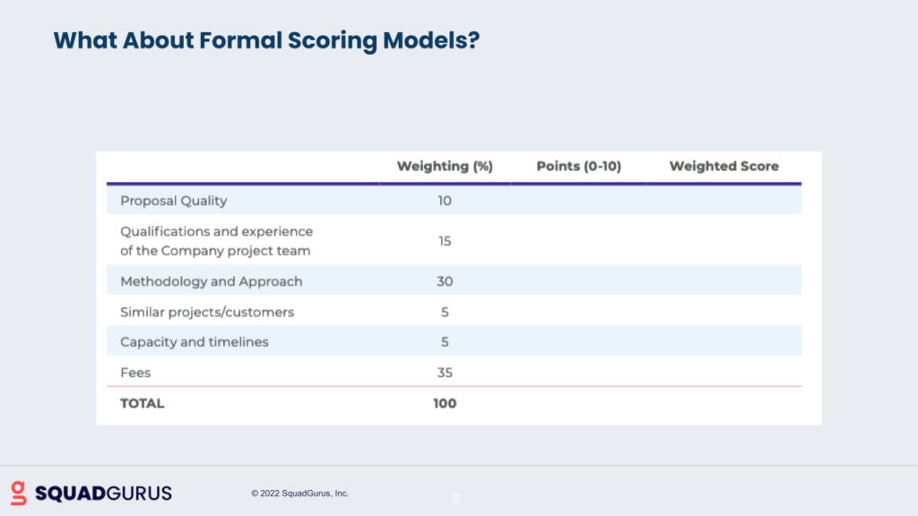 In public sector procurement and in large-scale RFP operations, that’s more common. In a traditional commercial decision using these scoring models sounds really great, but they can be a little bit restrictive because it’s really hard to be that precise about what the weighting should be on something. And you may find that there are factors that are more important than you think as you go through the process – that’s where we backup.