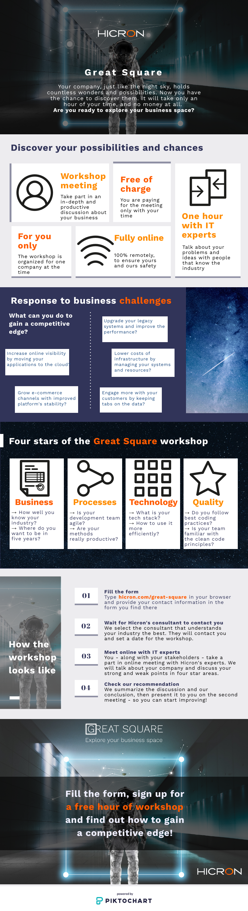 Take a part in Great Square workshop – it is free, one-hour long meeting with -Hicron Software House experts, that will take a closer look at your company in four areas: business, technology, processes, and quality. After the meeting, they will give you suggestions considering changes and transformation that can change your company, and make you earn more money in return.